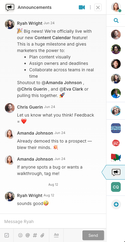 Unlike Direct or Group Chats, Channels are designed for topic-specific collaboration. They keep everyone in sync around the same conversation thread.