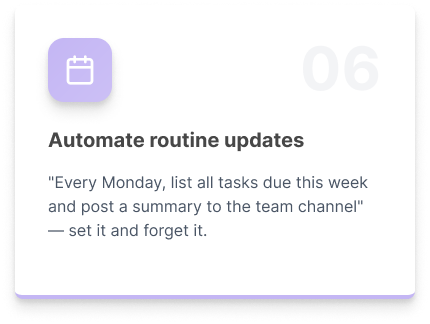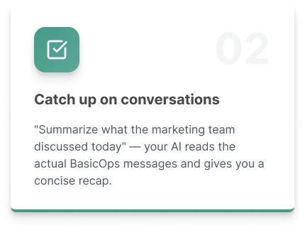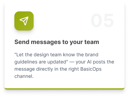 Why this matters: BasicOps is the only PM tool with built-in messaging tied to every task and project. With our MCP Server, your AI assistant gets access to both your project data and your team conversations in one place — no Slack integration needed.
